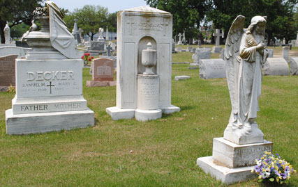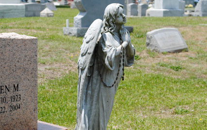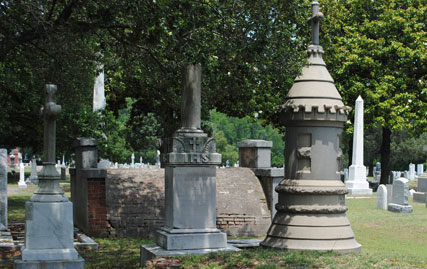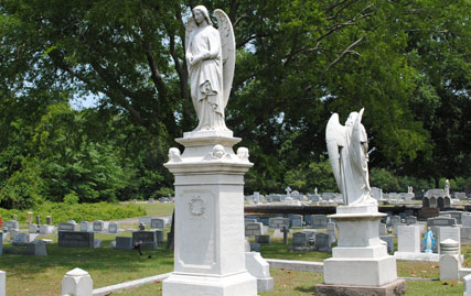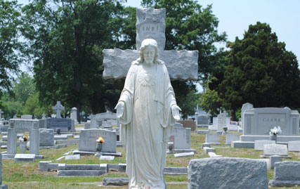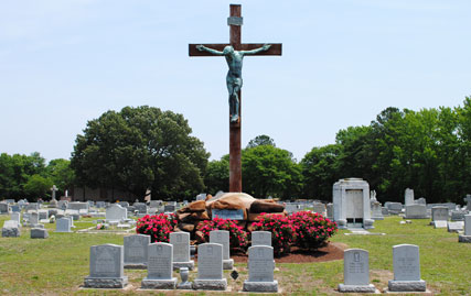 Saint Mary's Catholic Cemetery, a burial ground primarily serving the Catholic communities of Norfolk, Virginia Beach, and Chesapeake, comprises approximately 30 acres of mostly developed land. The cemetery is located at the intersection of Church Street and Monticello Avenue and lies adjacent to the Lafayette River and the Virginia Zoological Park in Norfolk. The Lafayette River and its small tributaries form a natural separation from property owners on the cemetery's north, south, and east boundaries. Aside from a few hills in the older sections, the cemetery lies on relatively flat ground. The property was purchased in 1854 by Father Matthew O'Keefe, who was the founder and pastor of Saint Mary's Catholic Church in downtown Norfolk. (VDHR 122-24). The main entrance gate was erected in 1956 and is comprised of an overhead iron arch supported on twin red brick columns. A 4 foot high red brick wall extends outward from each column for 12 feet and connects to a six foot aluminum fence the same height that stretches in both directions along the entire west boundary of the cemetery. Large magnolia trees planted in the early 1960's line the main entrance of the cemetery. There are also numerous large oak, cedar, and pine trees and smaller crepe myrtle trees along with seasonal flowers displayed in public areas that compliment the cemetery's landscape. Magnificent white marble statues and crosses and huge granite monuments and vertical columns are plentiful throughout. Aside from the asphalt roads that meander through this historic district, there are numerous walking paths between rows of lots. The walking paths measure from 5 feet to 18 feet in width. Many of the paths were dirt roads at one time and in an effort toward preservation, several paths were blocked off with concrete curbing in the early 1960's. It was during this period that a number of the wider walking paths were made available as gravesites. The cemetery centerpiece is a large bronze crucifix erected around 1922 in honor of Catholic servicemen who served in World War I. The sculptor was George A. Lober. This crucifix is identical to a crucifix displayed at the Aquia Shrine located on Route 1 between Richmond, Virginia and Washington, DC. It stands approximately 30 feet high and is surrounded by large stone boulders and on three sides by rows of rose bushes. There are 5 family mausoleums on the property along with a 416 crypt garden mausoleum, a 96 niche columbarium, and a 504 crypt/80 niche chapel mausoleum. Construction on the garden mausoleum began on March 31, 1979 by Acme Marble & Granite Company of New Orleans, LA. The garden mausoleum dedication was held on May 31, 1980 by Bishop Walter F. Sullivan of the Catholic Diocese of Richmond. The garden mausoleum, located at the rear of the cemetery, was the first cemetery owned mausoleum to be erected in the Richmond diocese. Located in front of the garden mausoleum and built and dedicated in 2003 is the cemetery's columbarium. The niches in the columbarium are available in single and companion units. Construction on the chapel mausoleum began in 2008 by Ingram Construction Company of Madison, MS. Bishop Francis X. DiLorenzo dedicated the structure on February 22, 2009 and was the first Catholic chapel mausoleum erected in the Hampton Roads area. The chapel mausoleum is located at the front of the cemetery near the south entrance. Since its beginning, management of Saint Mary's Catholic Cemetery had been an additional duty for the various pastors of Saint Mary's Catholic Church. In the early 1960's, cemetery management was shifted to the various succeeding pastors of Sacred Heart Catholic Church in Norfolk. Father Raymond Barton was the last priest/director of Saint Mary's Cemetery and in 1975 he established the present lay cemetery board. Mr. Michael J. Leonard is the current board president. The cemetery superintendent, Mrs. Alesia Raper, maintains a residence and office on the property and handles day to day operations, lot sales, and supervision of grounds maintenance staff. The year 1966 brought several major improvements to Saint Mary's Cemetery. Father Joseph L. Leitch was the cemetery director and Mr. Joseph F. Fitzpatrick was the superintendent. At that time the superintendent's residence/office was in need of a major renovation. After careful study the renovation was considered to be cost prohibitive. It was decided to build a new superintendent's residence/office and demolish the existing building. The former building was constructed of an a-frame tin roof with brown shingled siding. The current building is a red brick ranch a-frame design with a white shingled roof. A detached a-frame red brick maintenance building which adjoins the residence/office was constructed in 1985. It was also in 1966 that all the roads throughout the cemetery were paved with asphalt. Prior to that time the road surface consisted of dirt, rock, and cracked oyster shells. In 1998 board member John Langlois formed the "Friends of Saint Mary's Cemetery". The Friends is made up of a group of lot owners and other concerned individuals who volunteer their time and talents to raise funds and help maintain the cemetery grounds. The group meets at the cemetery on a regular basis and performs such duties as repairing damaged headstones, planting seasonal flowers, weeding, and trimming. The Friends also plan and sponsor an Easter Sunrise Mass each year that is held in front of the cemetery's garden mausoleum along with an All Souls Rosary/Mass each November which is held in the cemetery's chapel mausoleum. Board member Joanie Woodard publishes a semiannual newsletter on cemetery activities which is mailed to lot owners and church parishes. The Friends of St. Mary's Cemetery under the direction of the late board member James Gearheart completed a year long project of power washing monuments and headstones throughout the cemetery. Through the ongoing dedication and efforts of the cemetery board, the Su